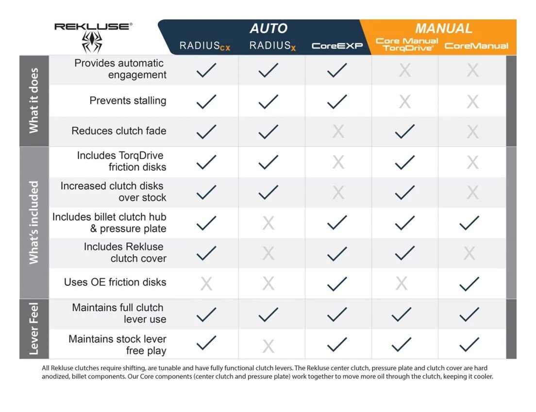 Trusted by elite racers and enthusiasts worldwide, the Rekluse Core EXP auto-clutch is the premiere centrifugal clutch system. Using the principles of centrifugal force this clutch automatically engages and disengages based on engine RPM. This means you can come to a complete stop in gear, or lock up the rear wheel before a corner without ever touching the clutch lever and your bike stays running.