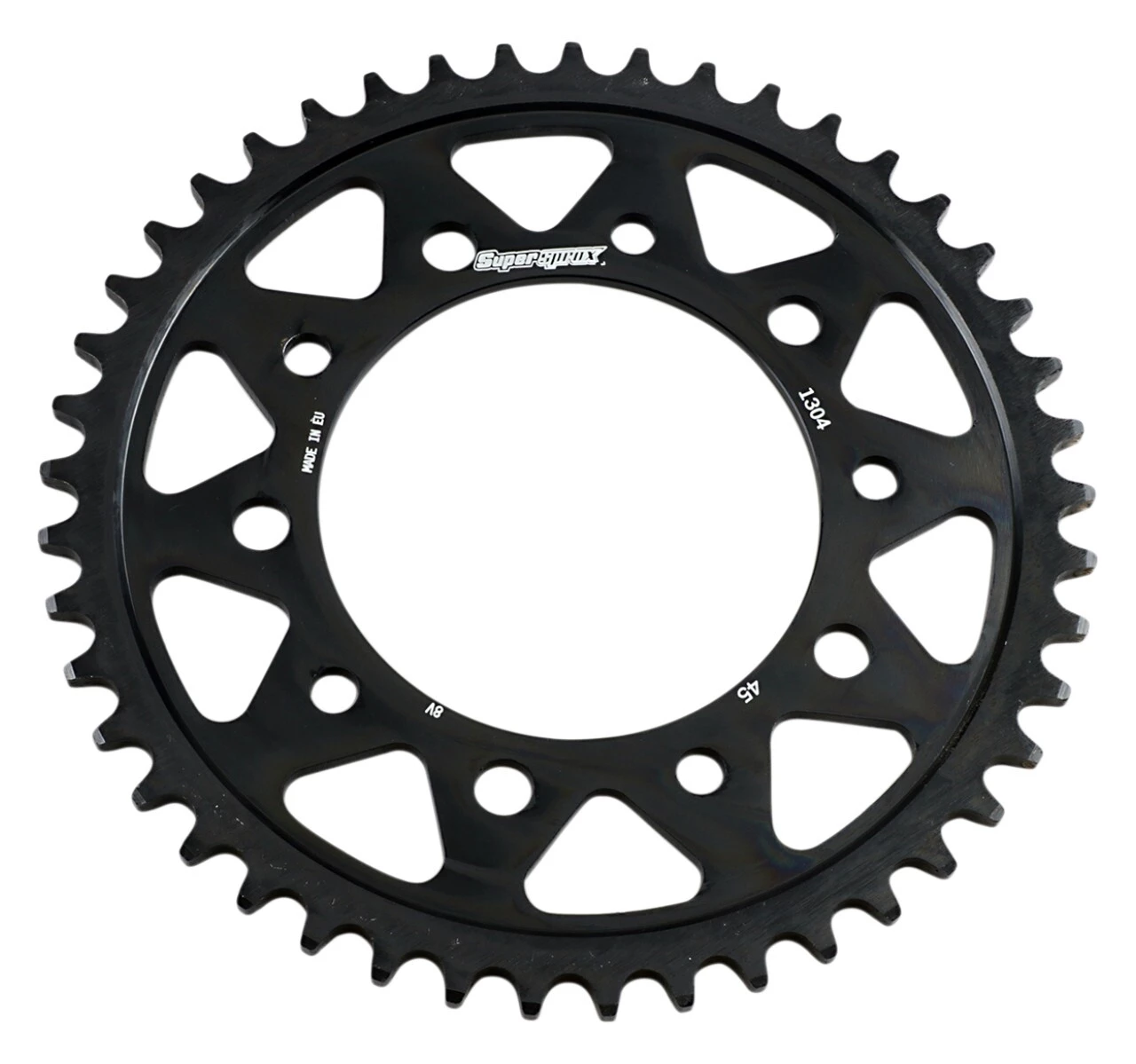 One of the many tricks up this steel sprocket’s sleeve is SuperSprox’s Tri-Zinc coating technology that utilizes three distinct coatings for a trifecta of high performance, longevity and good looks. First, the sprocket is coated in a mixture of silver and nickle, which fights corrosion. The second step in the coating process is a black passivation that fills the micro pores in the steel’s surface, ensuring abrasive rust and road debris aren’t able to become lodged in between your drive components for long enough to cause serious damage. Finally, the steel is finished with a slick, smooth top coat that helps keep it clean and looking good for years to come.